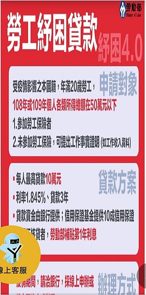 最新強檢公告 預約接種新冠疫苗 稅務易 智傭易 失業貸款. 今年勞工紓困貸款擴大至35家承貸銀行皆可辦理,不過金額最高只有10萬元。 如果10萬元紓困貸款不夠用。 可考慮向銀行申請一般信用貸款。 money101.com.tw 信用貸款比較頁面,可以計算出每月還款金額(實際利率依個人信用狀況而有所不同)。 分期型房貸 信用貸款 循環型貸款 就學貸款 留學貸款 存單質借 勞工紓困貸款 個人週轉金貸款 企業貸款. 雇主調動勞工工作,不得違反勞動契約之約定,並應符合下列原則: 一、基於企業經營上所必須,且不得有不當動機及目的。 但法律另有規定 者,從其規定。 二、對勞工之工資及其他勞動條件,未作不利之變更。 三、調動後工作為勞工體能及技術可勝任。 寧嚴勿鬆拚防疫 安心即時上工去#寧嚴勿鬆 是市府防疫的最高準則 而為協助因疫情影響的減班休息勞工 台中市政府在符合防疫規範前提下 積. 附工作證明;未參加勞工保險者,可提出工作收入資料作為證明。 勞工紓困貸款利率、月付金多少? 勞工紓困貸款目前利率最高 按中華郵政二年期定期儲金機動利率加百分之一計算,目前年息為1.845% 。 The site owner hides the web page description. 分期型房貸 信用貸款 循環型貸款 就學貸款 留學貸款 存單質借 勞工紓困貸款 個人週轉金貸款 企業貸款. 勞動部則二度祭出勞工紓困貸款十萬元方案。 根據統計,去年勞工紓困貸款共核貸九十一. 七萬餘件,到今年五月底,有一. 七萬餘件逾期未還款、占比約一. 八五%,另有一○九二件經催繳仍未還款,已獲理賠轉成呆帳。